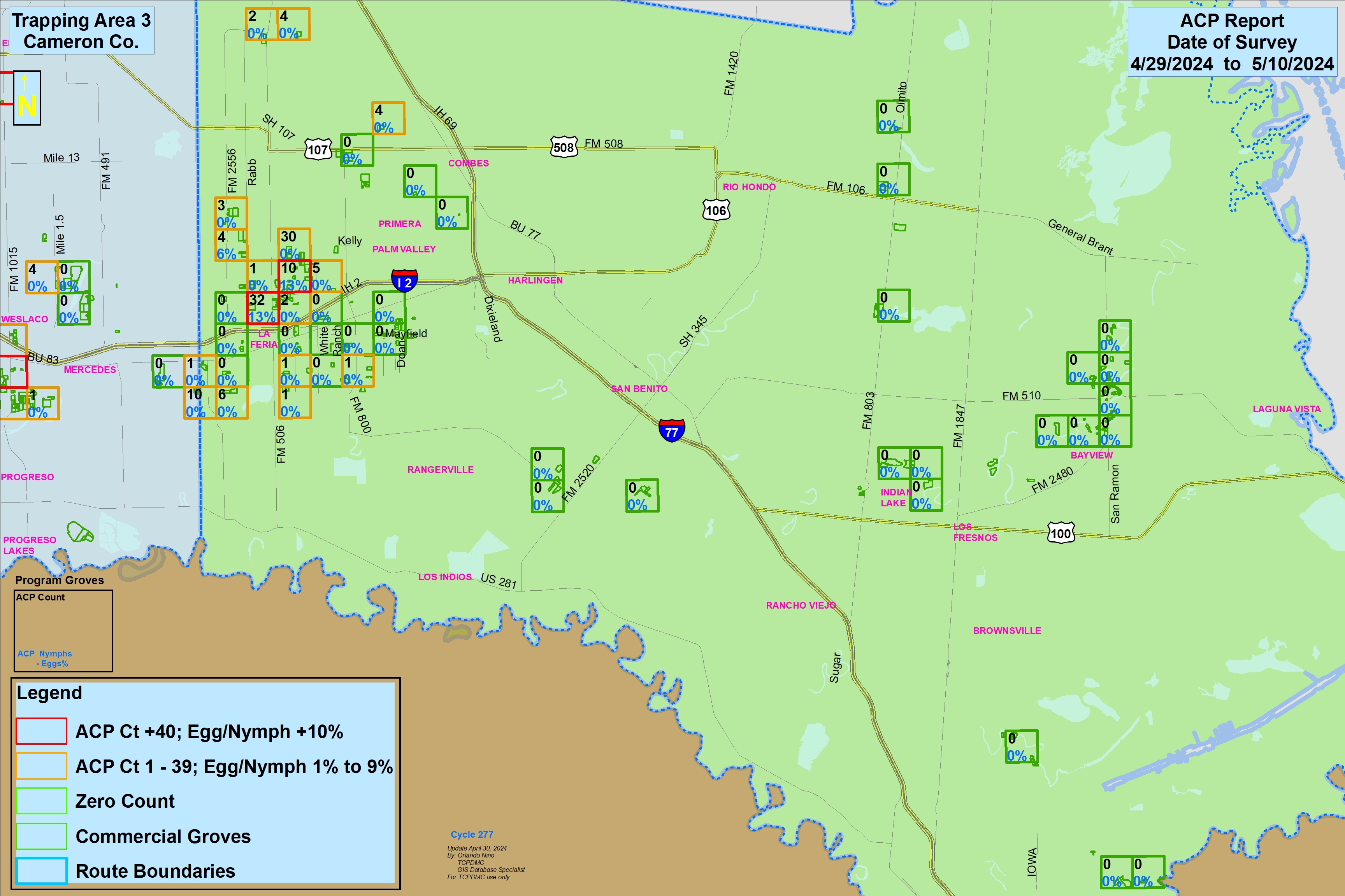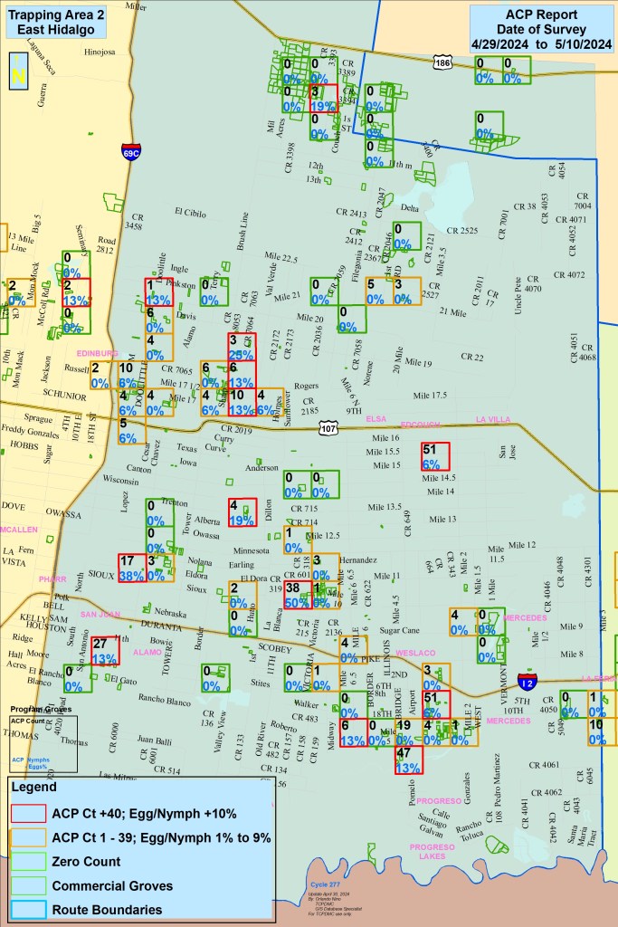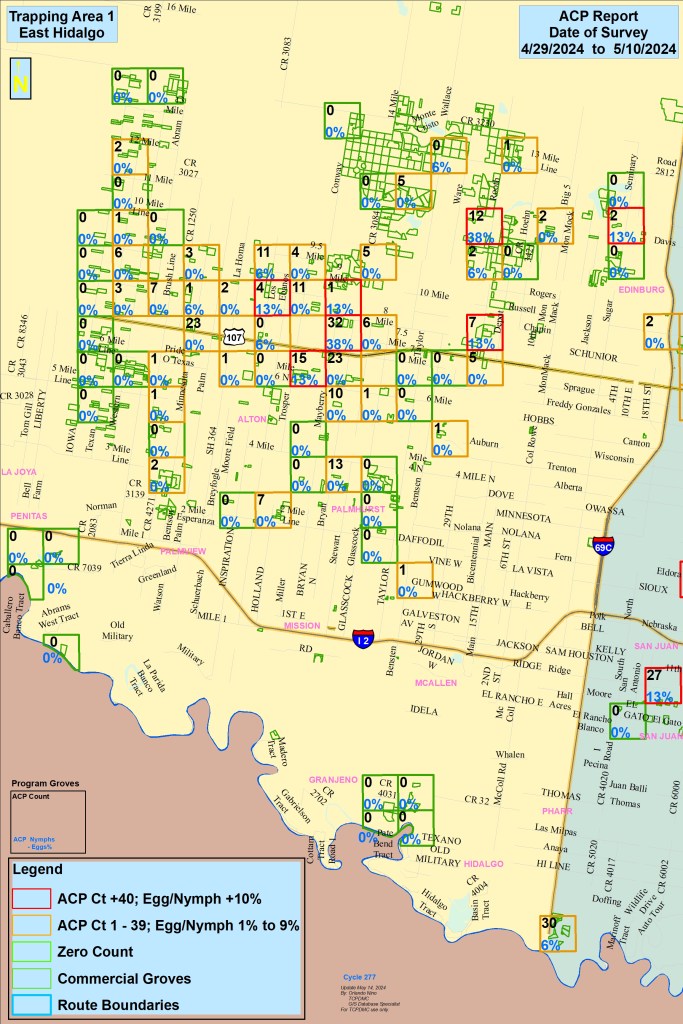 Our scouts collect ACP population counts from across the RGV daily. We input this information into maps to help grove managers best plan their ACP treatments. Below are detailed maps and descriptions about ACP populations in your area. The maps below are sectioned into 3 zones. Click on the zones that you want to view the information up close. How to read the maps is described at the bottom of this page.