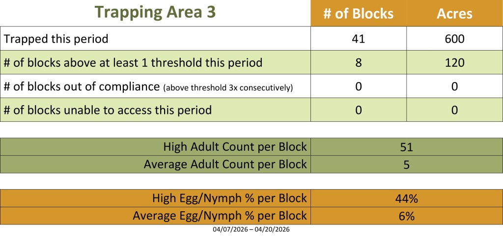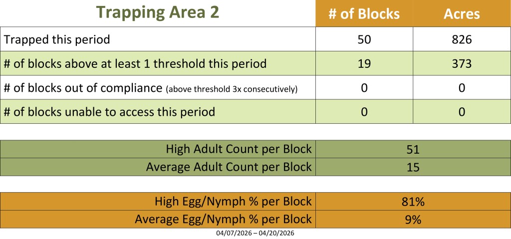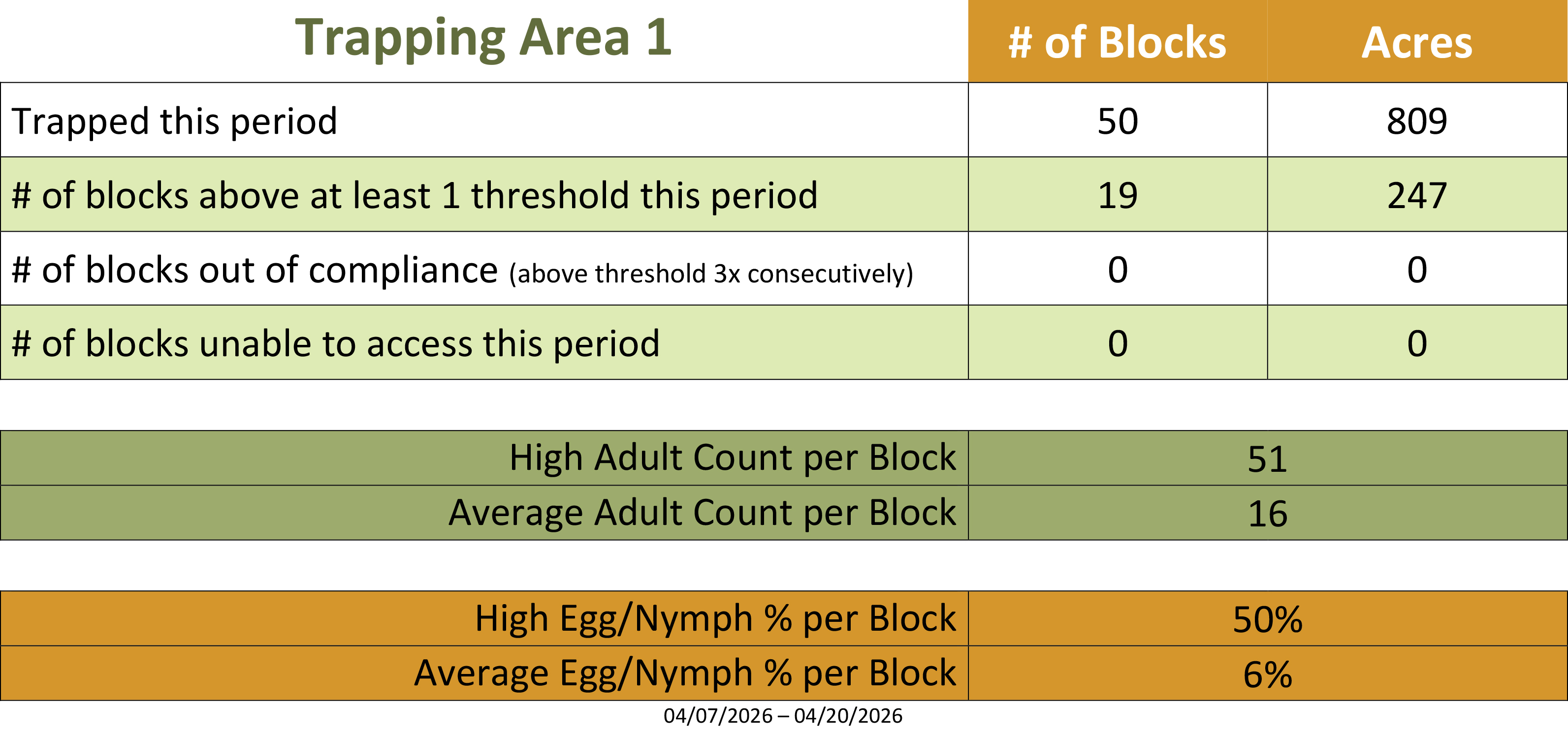 INSIDE EACH BOX: the BLACK number in the top left corner represents the highest individual ACP adult count that we found in that 2-week cycle.