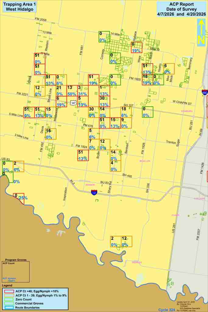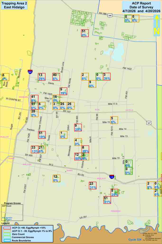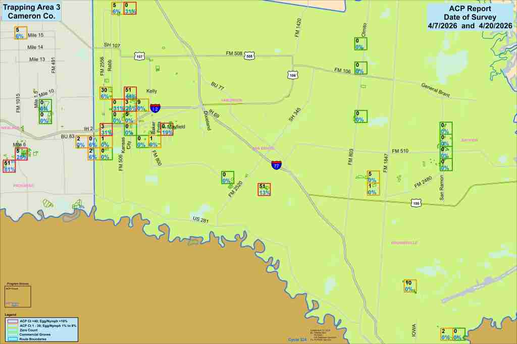 Our scouts collect ACP population counts from across the RGV daily. We input this information into maps to help grove managers best plan their ACP treatments. Below are detailed maps and descriptions about ACP populations in your area. The maps below are sectioned into 3 zones. Click on the zones that you want to view the information up close. How to read the maps is described at the bottom of this page.