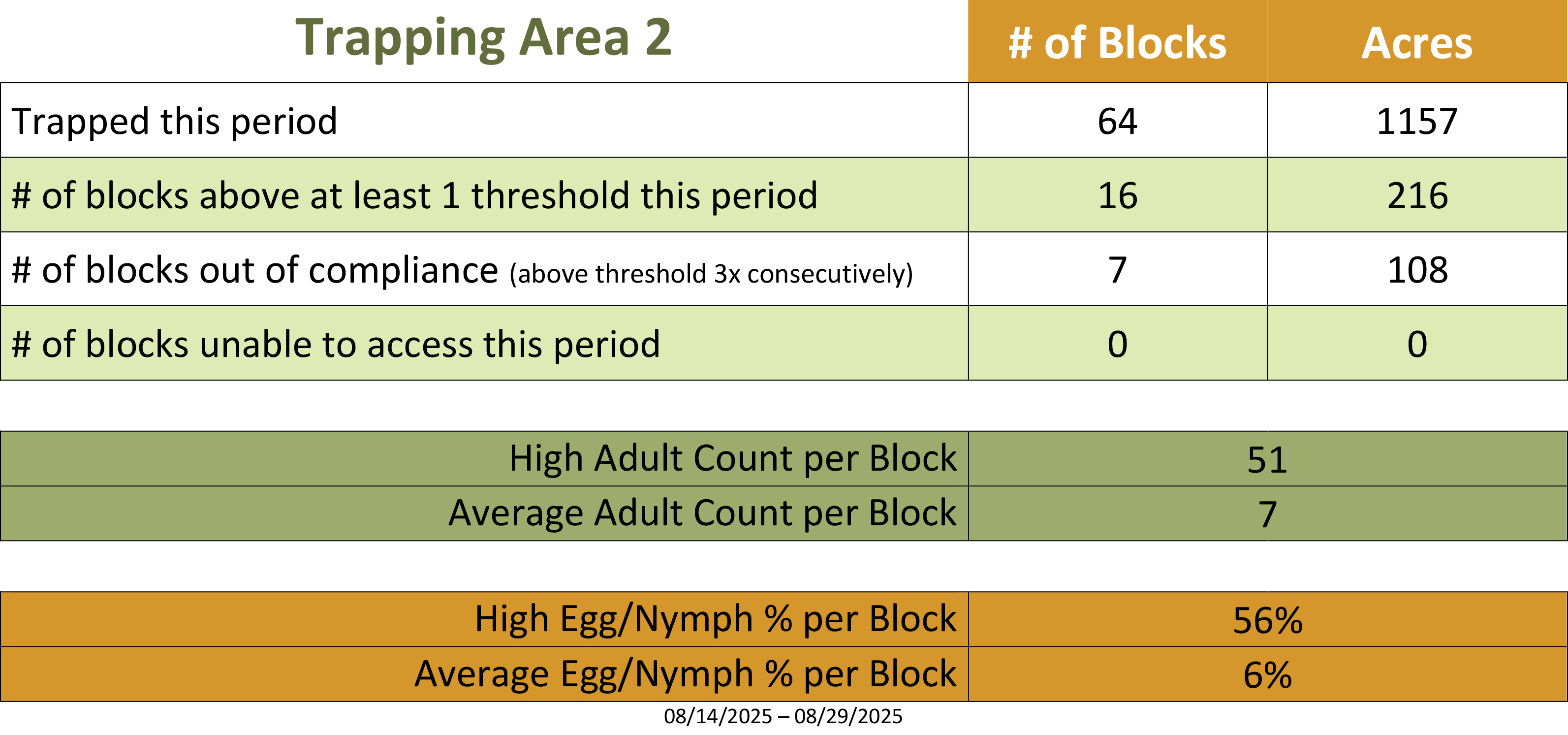 INSIDE EACH BOX: the BLACK number in the top left corner represents the highest individual ACP adult count that we found in that 2-week cycle.