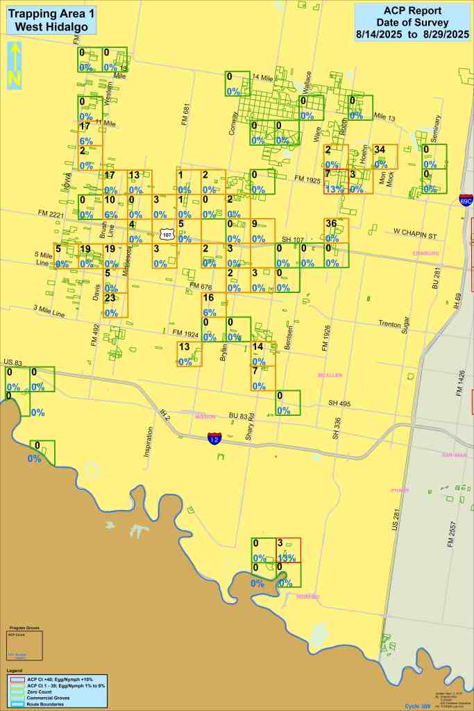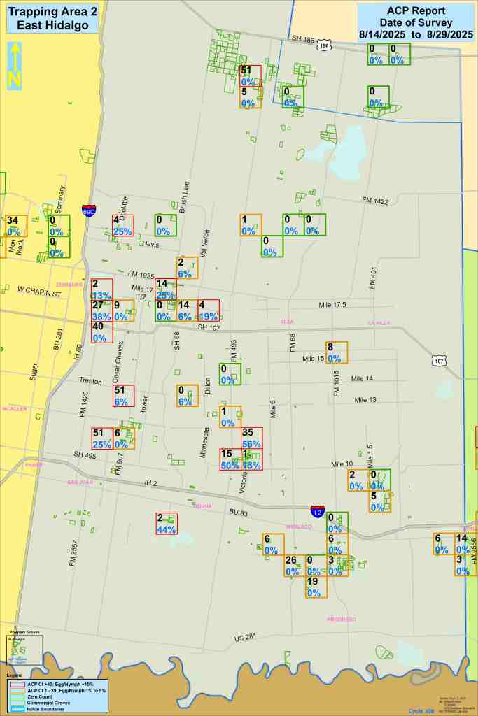 Our scouts collect ACP population counts from across the RGV daily. We input this information into maps to help grove managers best plan their ACP treatments. Below are detailed maps and descriptions about ACP populations in your area. The maps below are sectioned into 3 zones. Click on the zones that you want to view the information up close. How to read the maps is described at the bottom of this page.