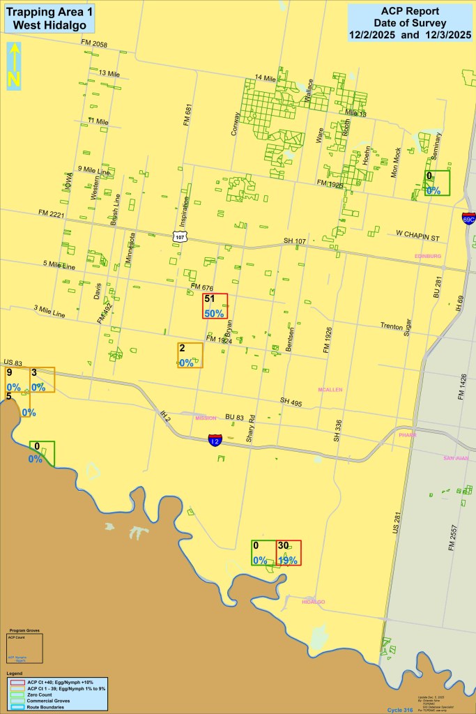 Our scouts collect ACP population counts from across the RGV daily. We input this information into maps to help grove managers best plan their ACP treatments. Below are detailed maps and descriptions about ACP populations in your area. The maps below are sectioned into 3 zones. Click on the zones that you want to view the information up close. How to read the maps is described at the bottom of this page.