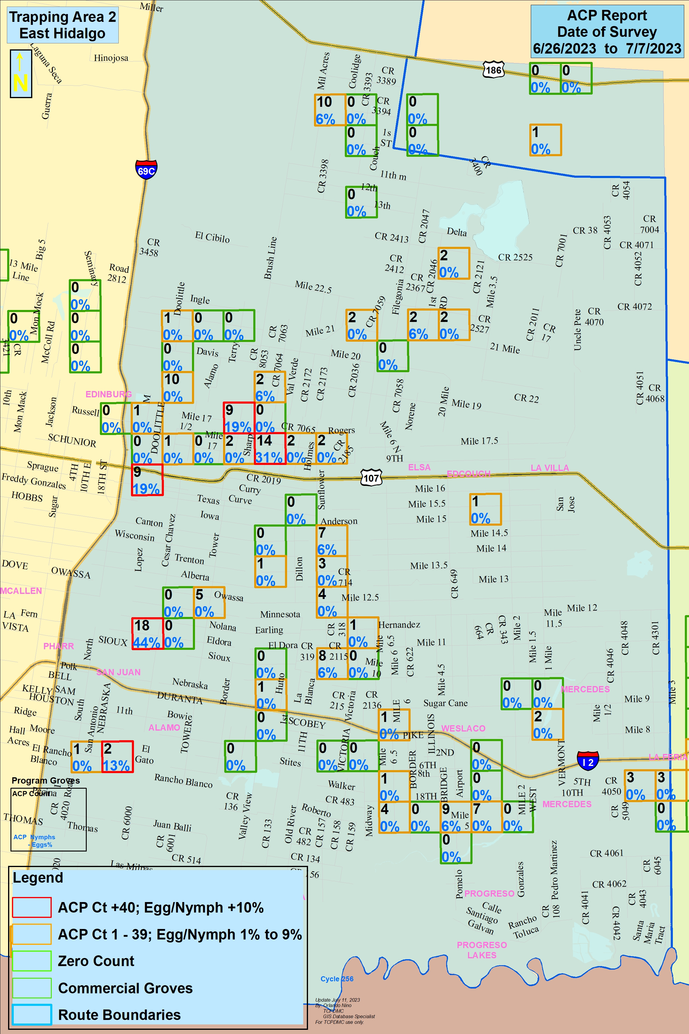 Our scouts collect ACP population counts from across the RGV daily. We input this information into maps to help grove managers best plan their ACP treatments. Below are detailed maps and descriptions about ACP populations in your area. The maps below are sectioned into 3 zones. Click on the zones that you want to view the information up close. How to read the maps is described at the bottom of this page.