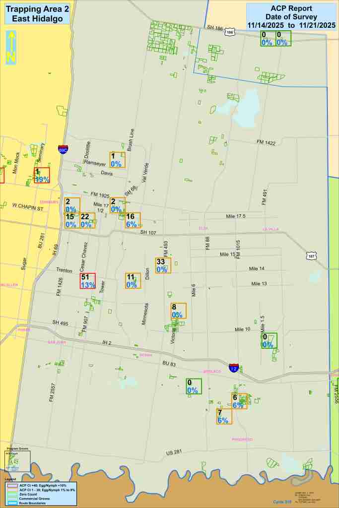 Our scouts collect ACP population counts from across the RGV daily. We input this information into maps to help grove managers best plan their ACP treatments. Below are detailed maps and descriptions about ACP populations in your area. The maps below are sectioned into 3 zones. Click on the zones that you want to view the information up close. How to read the maps is described at the bottom of this page.