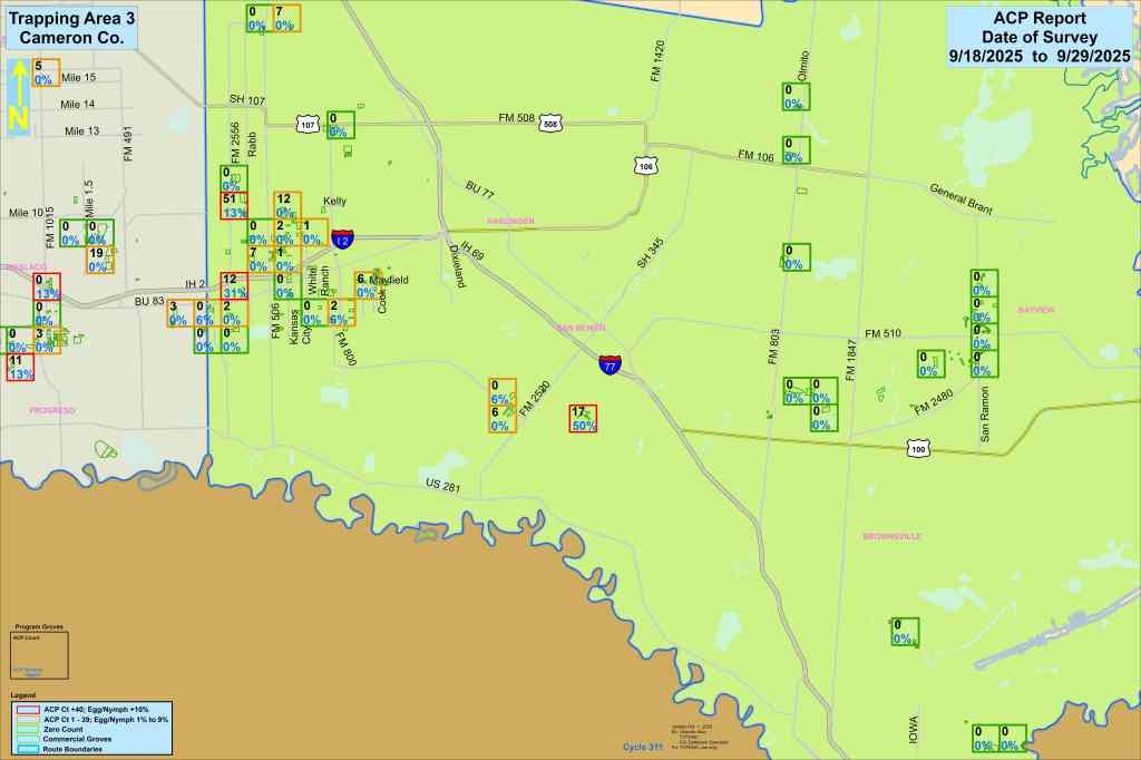 Our scouts collect ACP population counts from across the RGV daily. We input this information into maps to help grove managers best plan their ACP treatments. Below are detailed maps and descriptions about ACP populations in your area. The maps below are sectioned into 3 zones. Click on the zones that you want to view the information up close. How to read the maps is described at the bottom of this page.