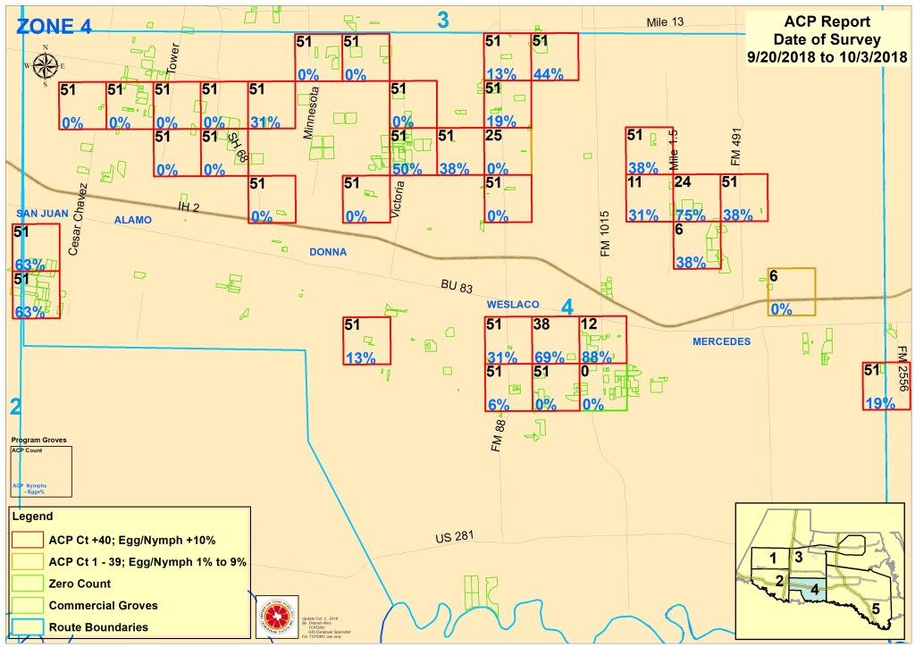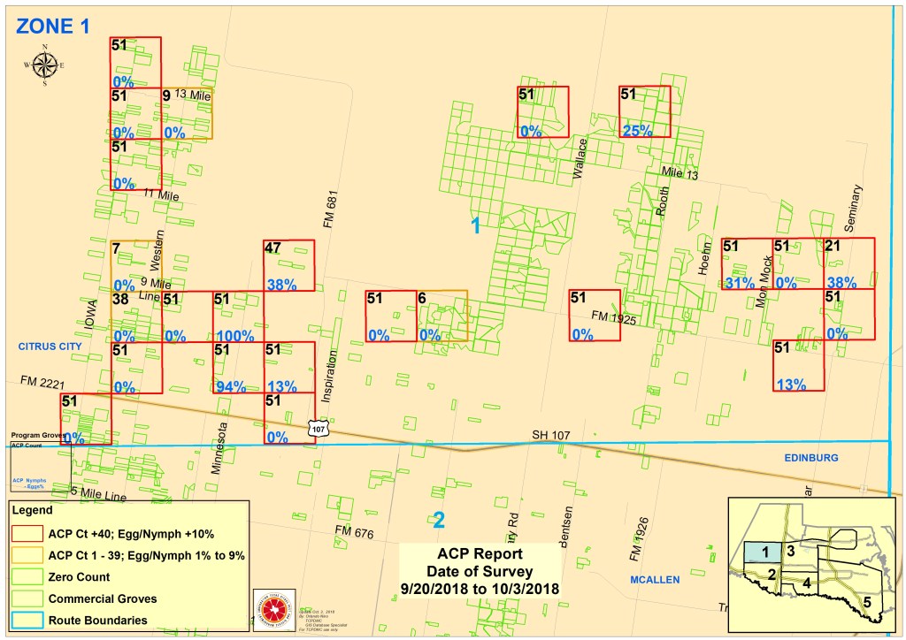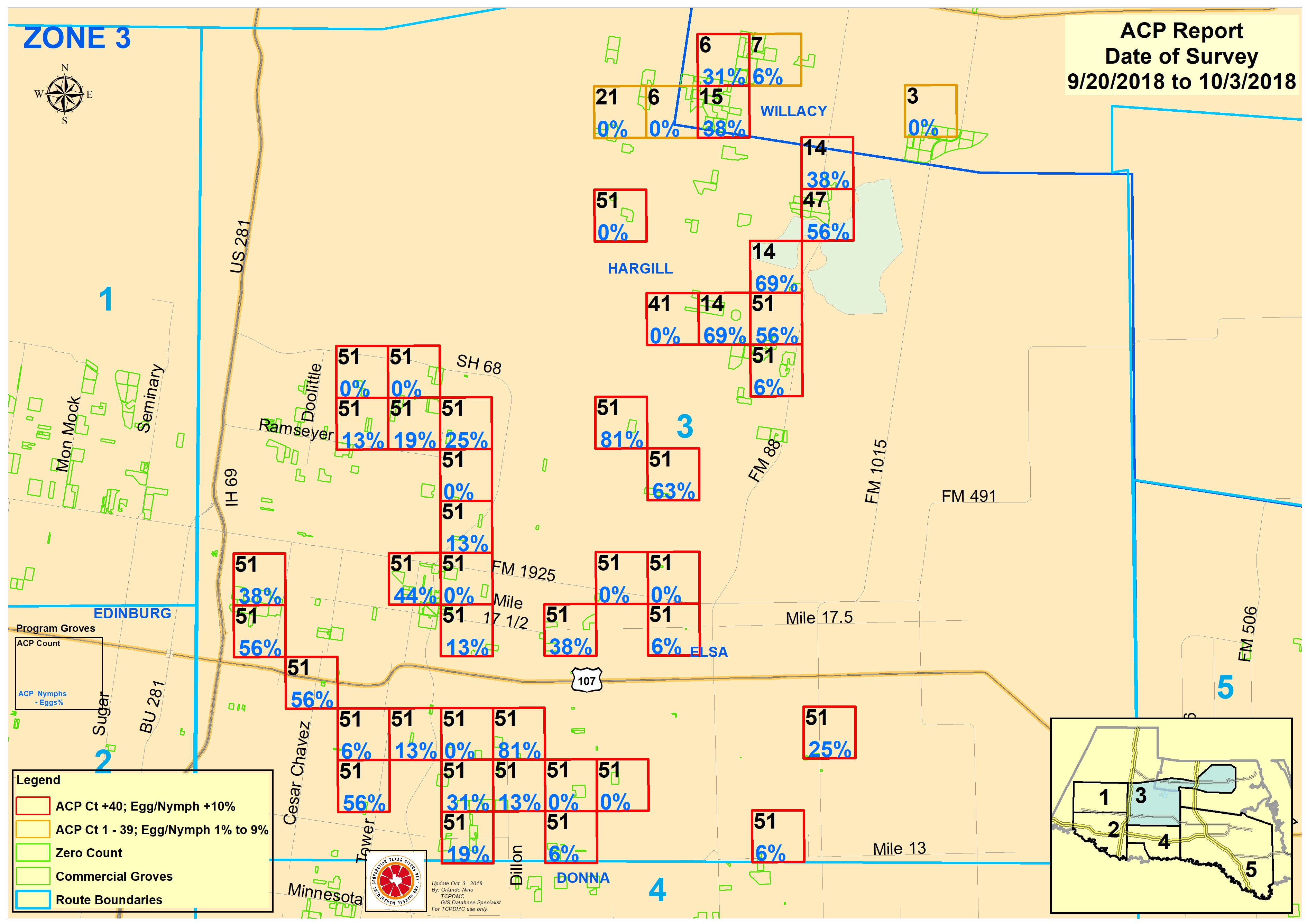 Our scouts collect ACP population counts from across the RGV daily. We input this information into maps to help grove managers best plan their ACP treatments. Below are detailed maps and descriptions about ACP populations in your area. The maps below are sectioned into zones. Click on the zones that you want to view the information up close. How to read the maps is described at the bottom of this page.