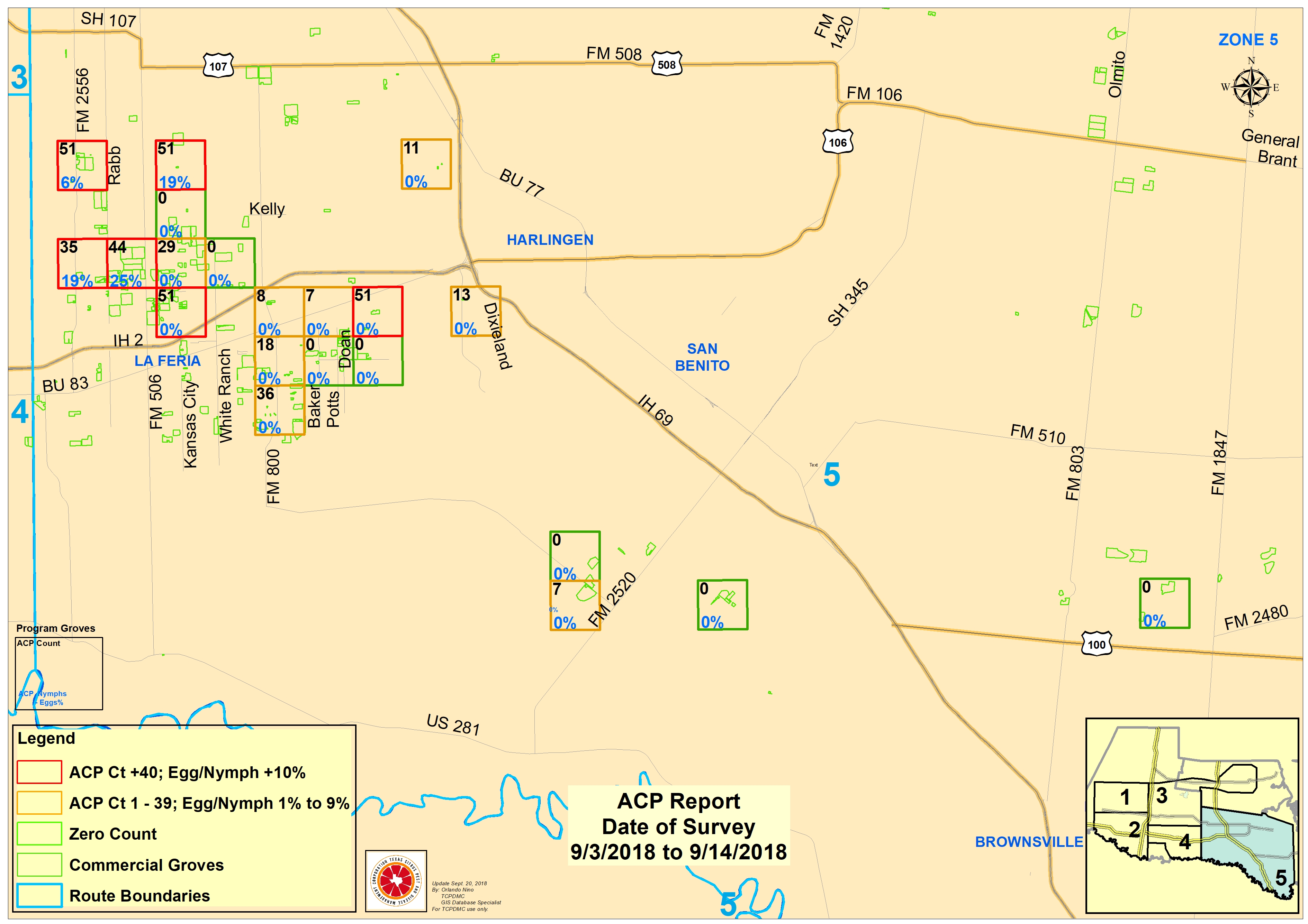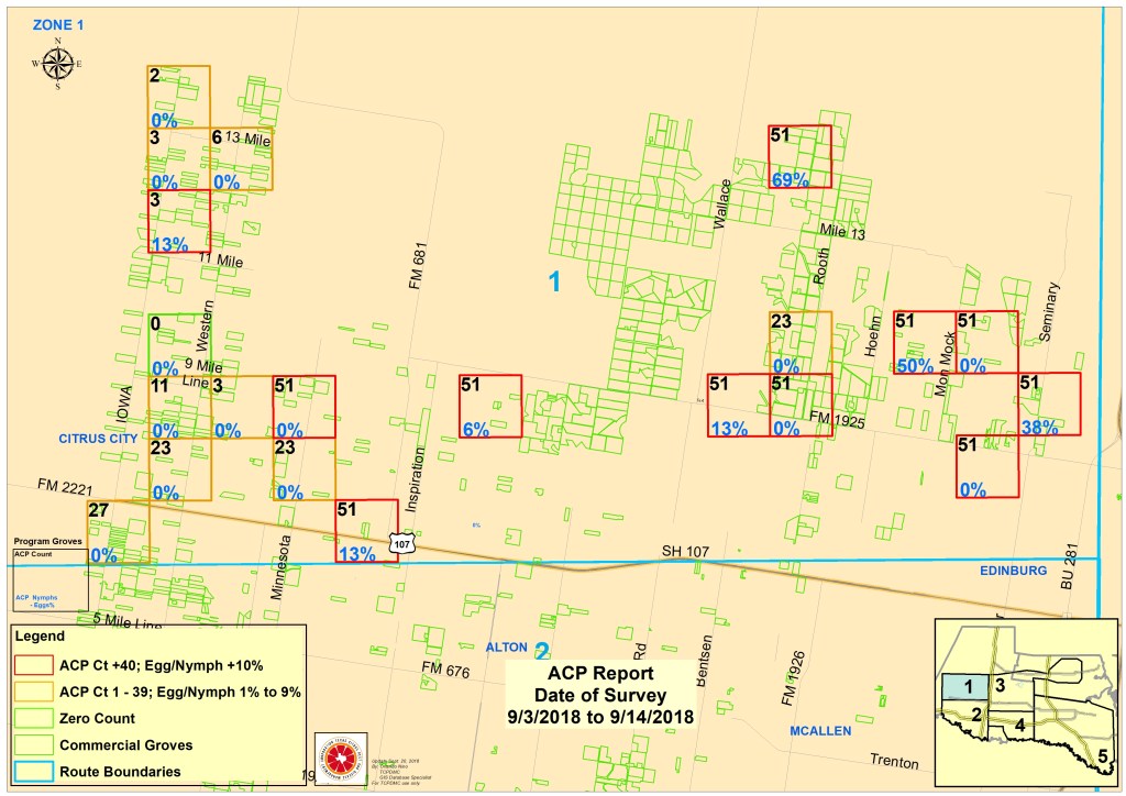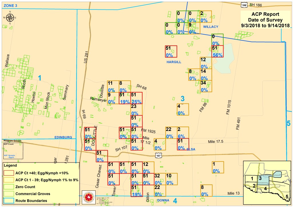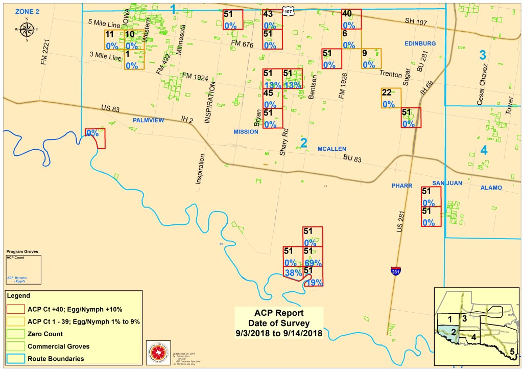 Our scouts collect ACP population counts from across the RGV daily. We input this information into maps to help grove managers best plan their ACP treatments. Below are detailed maps and descriptions about ACP populations in your area. The maps below are sectioned into zones. Click on the zones that you want to view the information up close. How to read the maps is described at the bottom of this page.